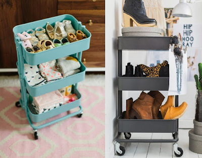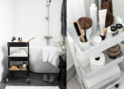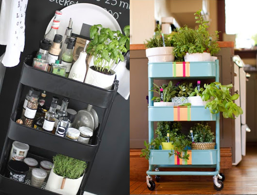 O carrinho de chá é um móvel bem versátil. Pode ser colocado em qualquer cômodo da casa, pode ser - mesmo que pintado - de qualquer cor, é charmoso, compacto e móvel. Ele é um pouco mais alto que uma mesa lateral e pode até servir para a hora do chá, mas se a gente usar a criatividade dá para pensar em várias funções, até ao mesmo tempo (como uma para o dia a dia e um reuso numa ocasião especial). Nesse post, as imagens são de um modelo um pouco mais moderno (que parece ser da IKEA, uma "Tok Stok" gringa), mas independente do estilo, ele vale mesmo é como inspiração. (Daqui)